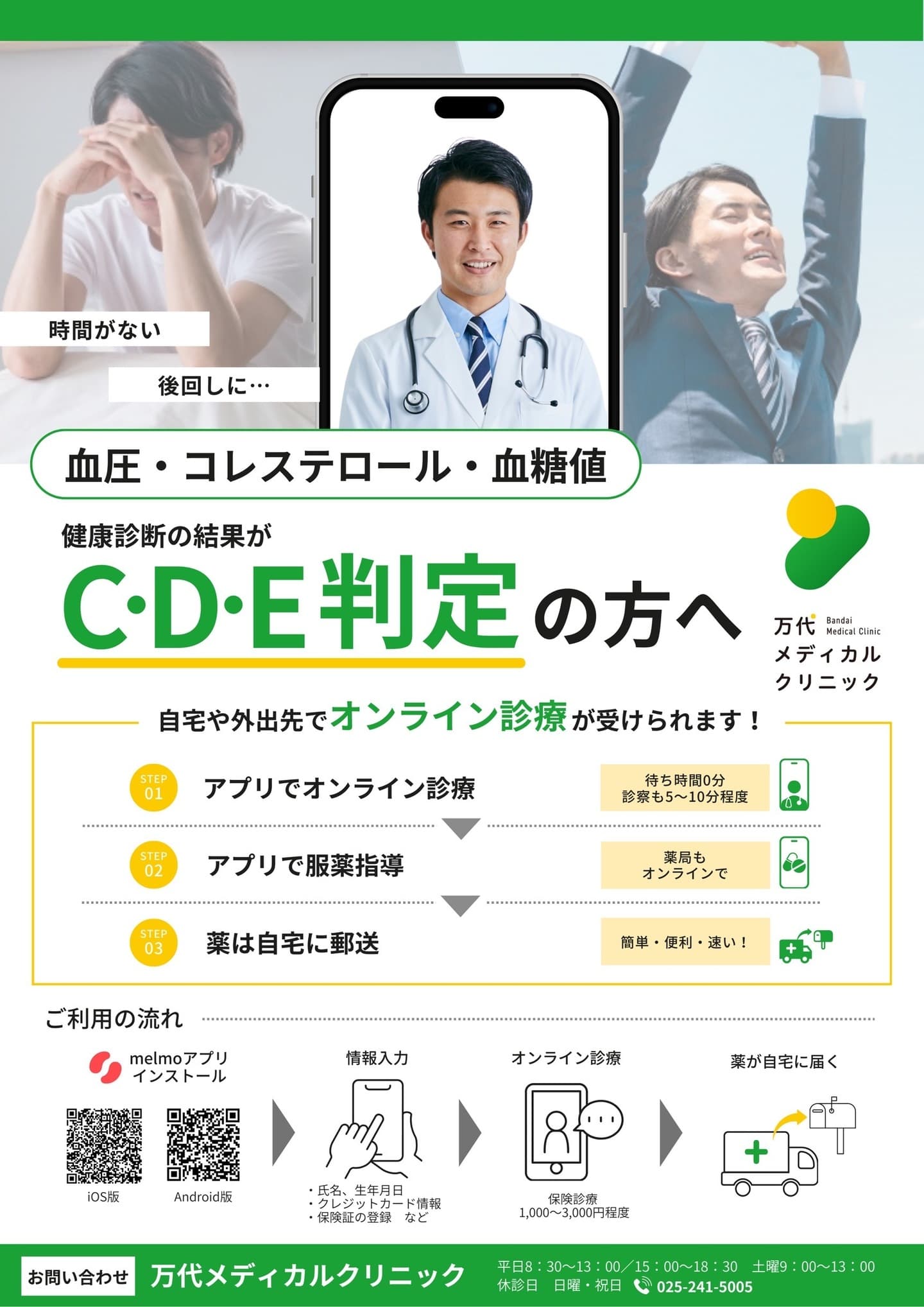 健康診断の結果について医師に相談したい方へ 健康診断で 血圧・コレステロール・血糖値などに異常を指摘された方 を対象に、オンライン診療 を行っています。通院の前に医師へ相談でき、必要に応じて治療や検査をご案内します。